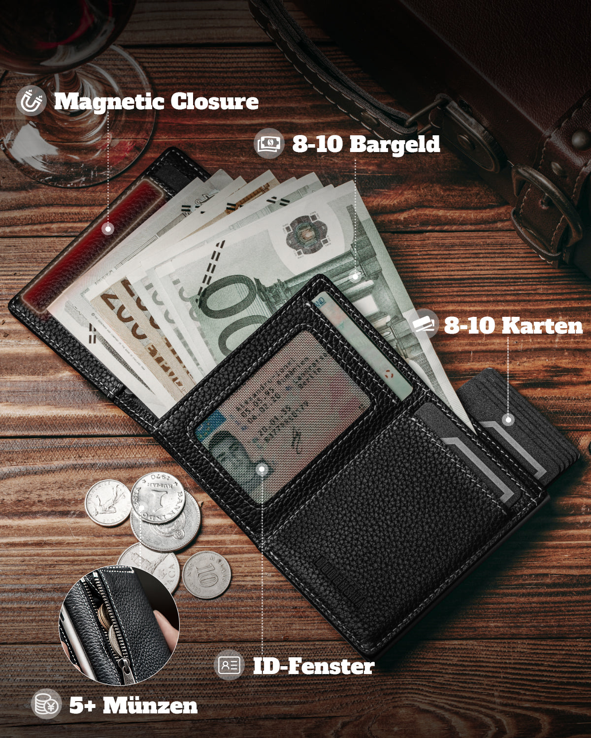 🔹 [MAGNETIC CLOSURE] Tired of the limitations of buttons? Our men's wallet features a magnetic snap closure that aims to free every customer from the constraints of buttons and allow the pleasure of easy opening and closing. The design of our men's wallet avoids possible scratches, detachments, and rust issues that can occur with button closures, giving you an excellent product experience.